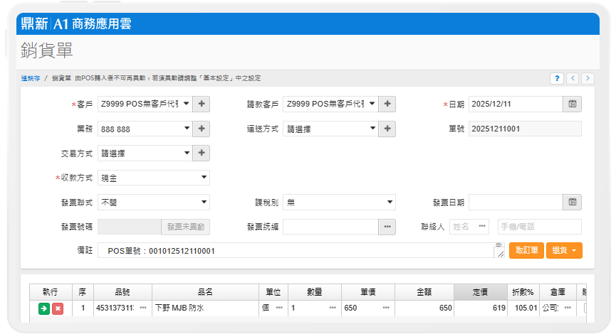 POS結帳後,立即產生銷貨單與明細,免手動輸入、免對帳麻煩,帳務管理更有效率